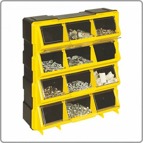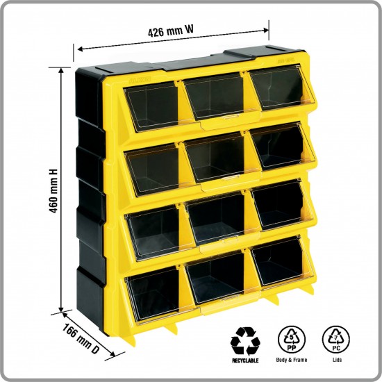 • Component Organizer ACO12PTL comprises of 12 pockets , the organiser body is made from High impact Polypropylene and the Lids are made from Polycarbonate. Lids are clear transparent and scratch resistant for good view of stored items.